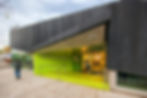 The 1-story structure is clad in glass fiber reinforced concrete (GFRC) panels cast in a curtain-like form of vertical folds. The GFRC façade is supported by a sloped, architecturally-exposed concrete beam that wraps the perimeter and creates a distinctive geometry. Only two columns, architecturally exposed and pulled back, support this beam, preserving the exterior openness and providing maximum interior flexibility.